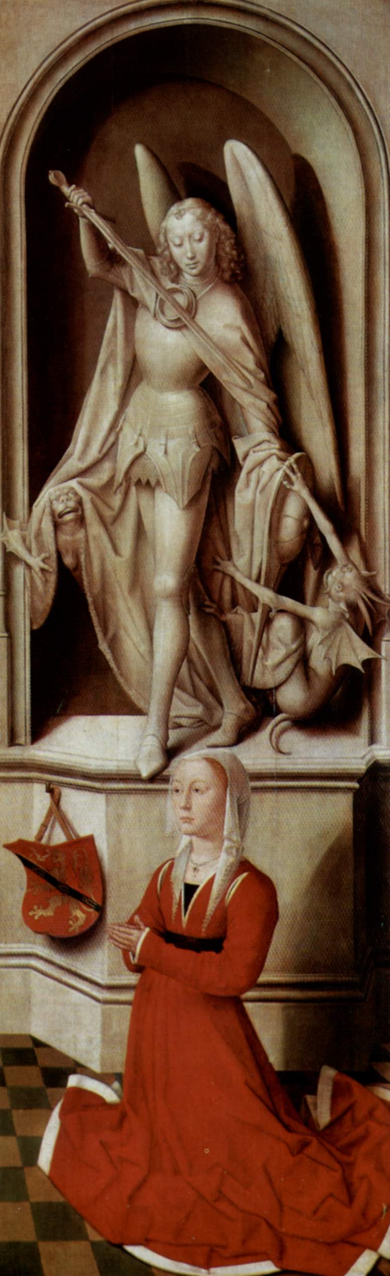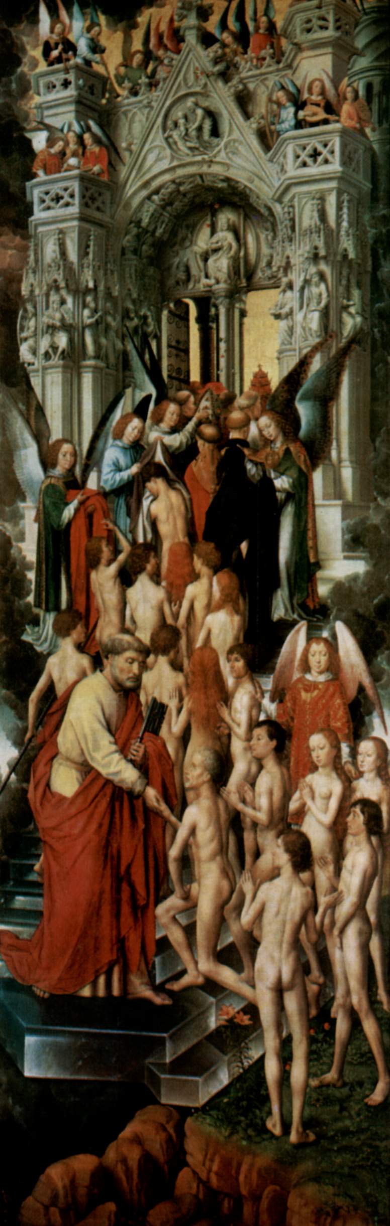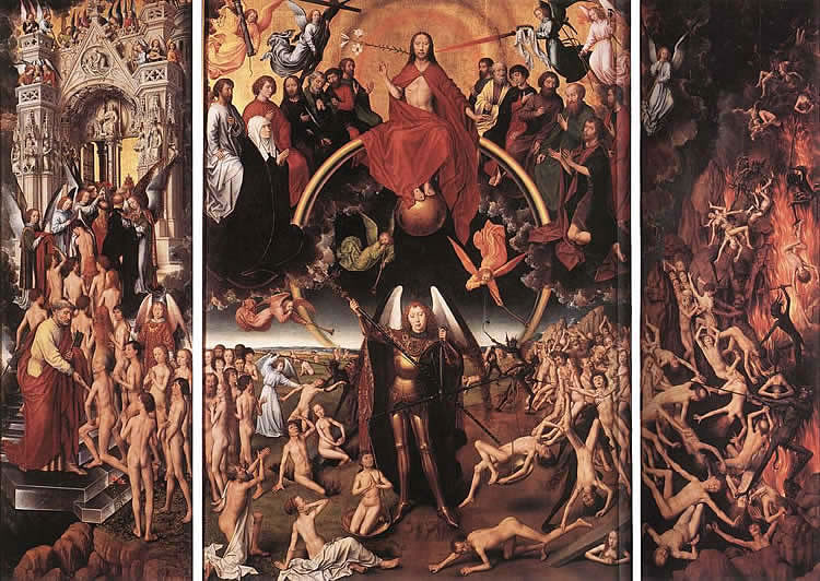 • Sąd Ostateczny, 1467 -1471, Sceny rozgrywają się nocą scena środkowa przedstawia na złotym tle, Chrystusa zasiadającego na tęczy ze stopami na złotej sferze – tęcza spaja i rozdziela królestwo Nieba i Ziemi otaczają go apostołowie Maria i Jan Chrzciciel aniołowie trzymują atrybuty męki Chrystusa poniżej aniołowie nad ziemią trąbią na Sąd Ostateczny ciała wychodzą z grobów Michał Archanioł rozdziela dusze na błogosławione i potępione (waga i pastorał) – na wadze dusza sprawiedliwa T. Portinariego – fundatora ołtarza na panelach bocznych – wejście do raju (portal gotycki) i św. Piotr z kluczami, drugi panel – przedstawienie dusz strąconych do piekła