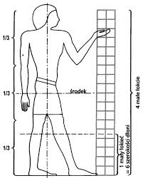 głowy z profilu, oczy i ramiona z przodu, nogi z boku
