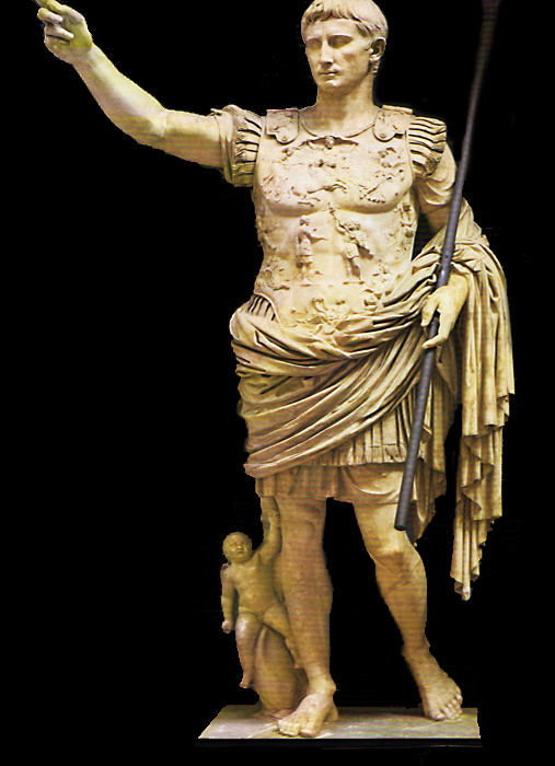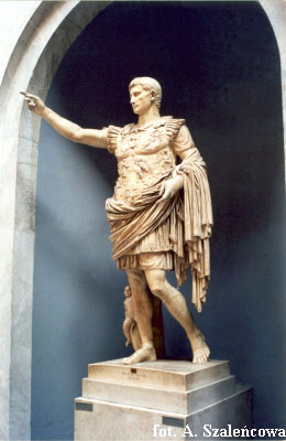 I w. n.e wystawiony był w prywatnej rezydencji cesarzowej Liwii w Prima Porta pod Rzymem przykład portretu oficjalnego, reprezentacyjnego przedstawia posąg cesarza Augusta jako wodza, w pancerzu, za berłem/ włócznią w lewej ręce, z wzniesioną ręką, przemawia do wojska reliefy pancerza upamiętniają sukcesy dyplomatyczne z królem Partów poza Augusta jest prosta, dostojna, surowa brak obuwia- heroizacja postaci portretowo potraktowana twarz wodza, nieco uszlachetniona dążenie do idealizacji postaci – wpływ rzeźby greckiej okresu klasycznego (Doryforos w układzie postaci, kontrapost) o boskim pochodzeniu przypomina Amorek, syn Wenus, pramatki Juliuszów u nóg Augusta