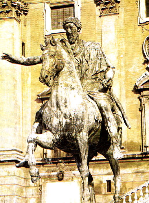 - , z czasów Antoniuszów II w. n.e w XVI w postawiony na środku Kapitolu przez Michała Anioła jedyny pozostały przykład rzymskiego pomnika konnego, wykonany w brązie złoconym postać cesarza przedstawiona w konwencji reprezentacyjnego portretu oficjalnego, gest pozdrowienia wodza skierowany do żołnierzy pomnik cechuje statyka ujęcia, miękkie oddanie rysów cesarza wywarł ogromny wpływ na sztukę nowożytną (np. warszawski posąg księcia Józefa Poniatowskiego — B. Thorvaldsena) Marek Aureliusz, żyjący w latach 121 -180 poza tym, że był cesarzem był także filozofem – stoikiem i pisarzem, wyznawane przez niego zasady znamy dzięki jego „Rozmyślaniom” (autor zawarł w nich wykład filozofii stoickiej skupionej na problematyce moralnej, wykład ma formę monolog z samym sobą, wyłania się z niego obraz władcy skromnego i umiarkowanego). „Rozmyślania” przesycone są sceptycyzmem i pewną rezygnacją, co odzwierciedla schyłkowość epoki, z której żył Marek Aureliusz - jego panowanie przypada na okres gdy barbarzyńskie plemiona coraz skuteczniej zagrażają potędze Rzymu