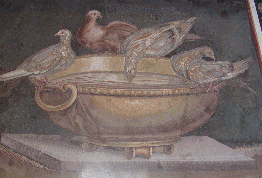malarstwo pompejanskie - aleksander wielki pod issos - zwierzęta morskie - nil - gołębie - gołębie pijące ze złotej czary - tematyka sakralna I styl zwany inkrustacyjnym • imituje farbą okładzinę z kolorowego marmuru, płaskość ozdabiają gzymsy, pilastry wykonane są w stiuku metodą reliefu, ustalona kolorystyka to ciemnoczerwony, żółty, czarny i biały – są one nasycone czystością