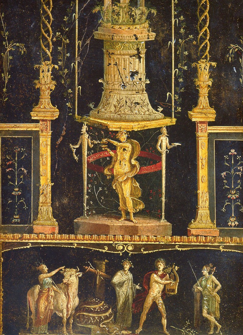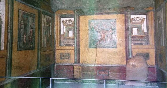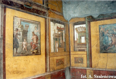 IV styl zwany iluzjonistycznym, 2 poł. I w. n.e do wybuchu Wezuwiusza w 79 r. malowidła nabierają charakteru fantastycznych kompozycji architektonicznych, a obrazy umieszczane na ścianach maja charakter przestrzenny i dynamiczny gama kolorów jest bogata, ulubiony to żółcień czasami postanawiają się postacie w scenach mitologicznych pełne kontrastów światłocieniowych zachowały malowidła, przedstawiające różne sceny z mitologii lub z życia codziennego w perystylu z żółto-złotymi ścianami podkreślonymi czerwonymi odsadzkami, pokrywały malowidła przedstawiające sceny mitologiczne na szczególną uwagę zasługują fryzy z amorkami zajętymi różnymi rzemiosłami, malowane są szybkimi i szerokimi pociągnięciami pędzla na czerwonym tle