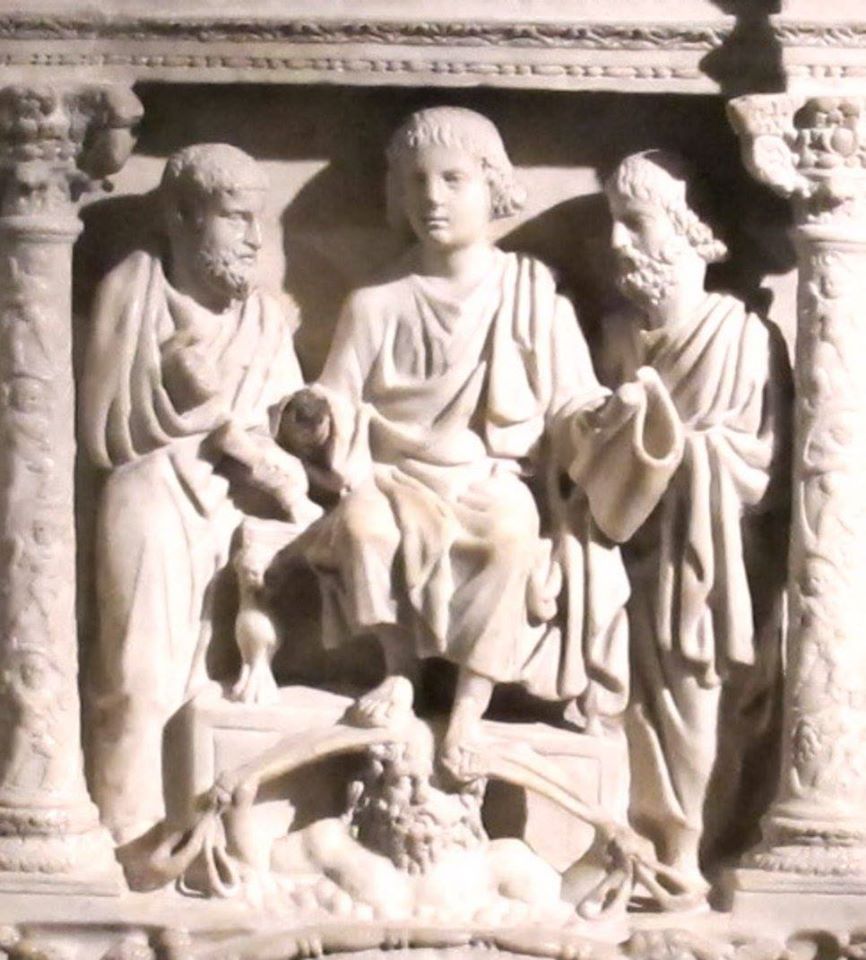 IV wiek - grobowiec prefekta Rzymu Juniusa Bassusa klasyczny w formie przedstawione postacie z N i S Testamentu nie opowiadają swojej historii poprzez gesty i emocje, sceny pełne są wyciszenia, pasywności, nie ma dramatu, bólu itd przednia ściana sarkofagu podzielona jest na dwa pasy, te zaś kolumienkami na poszczególne sceny jest to 10 kwater o formie kwadratu górna cześć : ofiara Izaaka, pojmanie św. Piotra, Centralnie scena Chrystusa Tronującego pomiędzy Piotrem i Pawłem, dwie kwatery Chrystusa przed Piłatem dolna część: Niedola Hioba, Adam i Ewa – grzech pierworodny, , wjazd Chrystusa do Jerozolimy , Daniela w lwiej jamie, św. Paweł prowadzony na śmierć. dobór scen akcentuje boską naturę Chrystusa