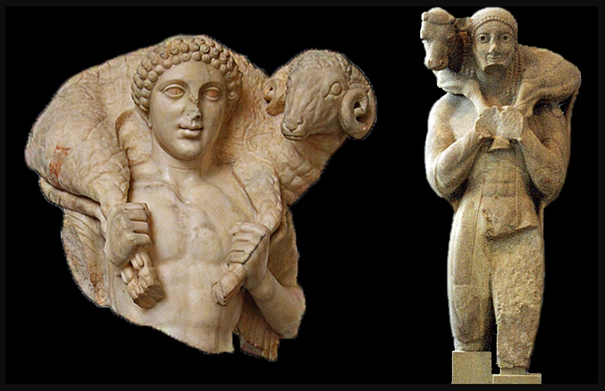 niosący baranka- jeden z epitetów określający Hermesa ( znany jako opiekun trzód), w ikonografii chrześcijańskiej jedno z najstarszych przedstawień Jezusa Chrystusa.