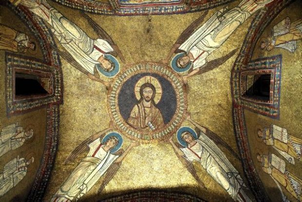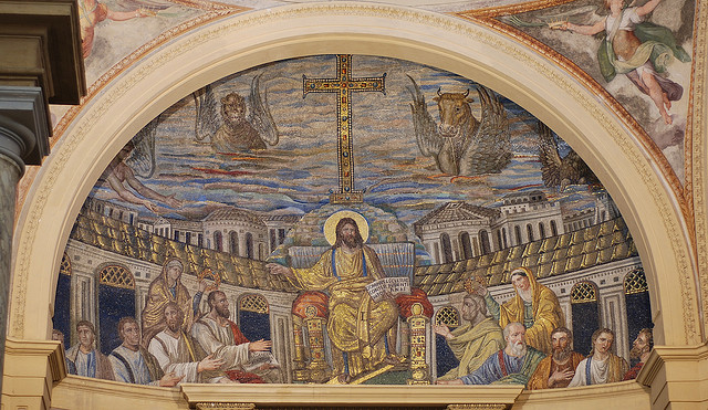 Jezus zasiada na wysadzanym klejnotami tronie, ma na sobie złotą togę z fioletowym wykończeniem, obydwa te kolory utożsamia się z władzą imperialną Traditio legis - jego prawa ręka wykonuje gest ad locutio, który w starożytnym Rzymie oznaczał specjalne przemówienie cesarza do zgromadzonych wojsk., w lewej ręce trzyma zaś księgę, dzięki której głosi słowo jest to zaczerpnięte z rzymskiej konwencji artystycznej która ma podkreślać rolę cesarza jako tego, który tworzy prawo złota aureola jest dzisiaj postrzegana jako przykładowy element sztuki chrześcijańskiej, jednak jej korzenie sięgają dawniej, do obrazów rzymskich takich jak np. wizerunek Teodozjusza za Chrystusem widzimy piękne miasto, w którego centralnej części znajduje się ozdobiony klejnotami krzyż - możemy rozpoznać, iż przedstawionym miastem jest Jerozolima, a wzgórze z krzyżem to Golgota nie jest to jednak ziemskie miasto, ale jego niebiański odpowiednik - wiemy to dzięki czterem postaciom unoszącym się nad krzyżem, czterema bestiami, które, według Apokalipsy św. Jana, miały towarzyszyć barankowi wizerunki uskrzydlonego mężczyzny, lwa, wołu oraz orła stały się symbolami Czterech Ewangelistów lew – św. Marek, orzeł – św. Jan, wół – św. Łukasz, anioł - św. Mateusz w tej mozaice ich zastosowanie oznacza, iż Jezus przebywa w Niebiańskiej Jerozolimie, gdzie jest on największym autorytetem (tak jak Cesarz był na Ziemi) krzyż ukazuje triumf Jezusa