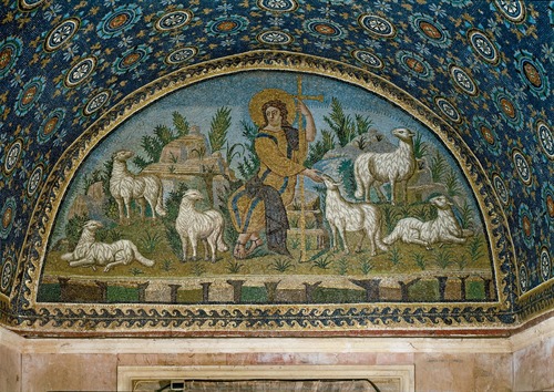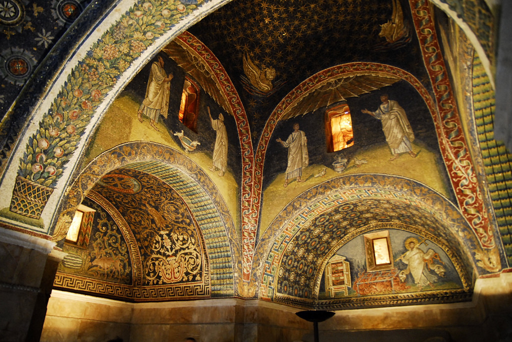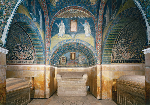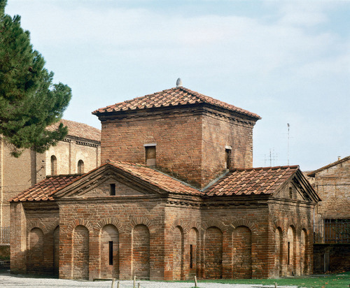 - 1 poł V wieku - (Jest budowlą grobową Galli Placydii, córki Teodozjusza I Wielkiego. Budynek zbudowany z cegły ma plan krzyża greckiego, o surowym wyglądzie. Jedynym urozmaiceniem ścian są ślepe arkady. Na każdej ze ścian znajdują się wąskie okna zamknięta półprzejrzystym kamieniem. Mozaiki. Plan centralny prosta budowla, łuki, blendy (ślepe okna z arkadami).) - budowla centralna - było częścią większego kompleksu - Santa Croce - zbudowanego przez cesarzową i przylegało do narteksu kościoła - mozaiki