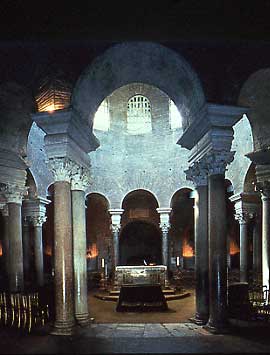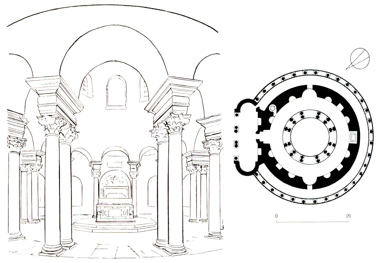 • mauzoleum córki cesarz Konstantyna • znajdowało się przy kościele św. Agnieszki za Murami w Rzymie • na planie centralnym, koła • przekryta kopułą • wnętrze klarowne i logicznymi podziałami przestrzeni • cylindryczny rdzeń – nawa oświetlona od góry oknami (odpowiednik nawy głównej w bazylice) i pierścień okalający w postaci nawy (odpowiednik bocznej nawy w bazylice) • bogata mozaika opisująca dogmaty i prawy wiary – na białym tle przedstawione łodygi winorośli z winogronami, motywy zbierania winogron, dzbany, , naczynia i rogi obfitości, ptaki • motywy geometryczne w zdobnictwie • sceny ze Starego Testamentu – ofiara Abrahama, Zuzanna i starcy, Tobiasz z rybą, postać Mojżesza wydobywającego wodę ze skały