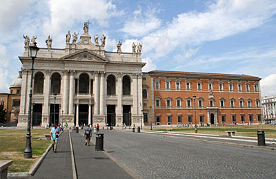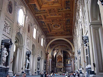 (904–911r – odbudowa)/ (Układ pilastrów i półkolumn podkreśla pięcionawowe wnętrze bazyliki. Fasadę wieńczy piętnaście siedmiometrowych figur, przedstawiających doktorów Kościoła z rzeźbą Chrystusa ustawioną w centralnej części. Wejście do bazyliki prowadzi z szerokiego narteksu. Ołtarz główny osłania gotycki baldachim. Nawę główną zamyka absyda, w której zwraca uwagę bogata mozaika wykonana w XIII wieku przez Jacopo Torriti i Jacopo da Camerino. Centralną część zajmuje Krzyż Święty, po stronie lewej Matka Boska i niewielka postać papieża Mikołaja IV, fundatora mozaiki.