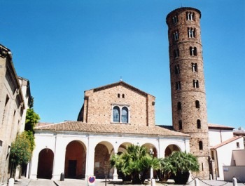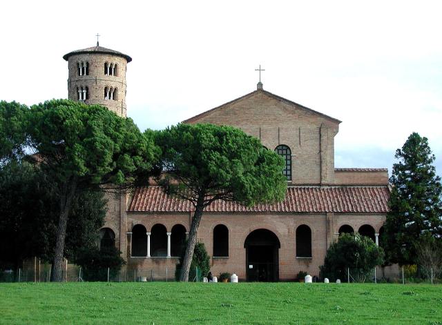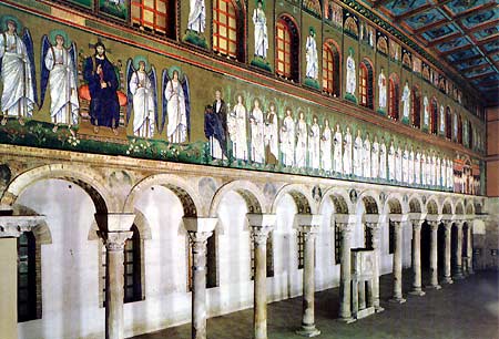 Nawa główna – 26 obrazów ze Starego i Nowego Testamentu, orszak dziewic i męczenników, widok pałacu Teodoryka i widok portu w Classe koło Rawenny