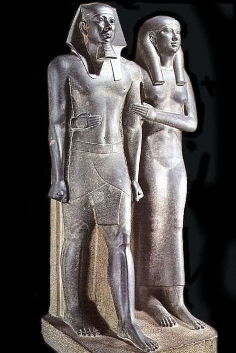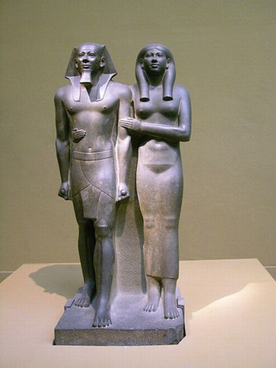 Posąg wykonany z łupku, odznacza się miękkim modelunkiem struktury ciała. Powstał ok 2500 lat p.n.e Jest to nietypowe, jak na kanon egipski przedstawienie postaci. Artysta nie tylko zrównał wzrostem króla i królową, ale ukazał zażyłość pomiędzy małżonkami poprzez gest, w którym królowa obejmuje króla prawą ręką. Obydwie postaci ukazane są w lekkim wykroku, czyli w postawie zastrzeżonej dla posągów mężczyzn. Wraz z kilku triadami rzeźba ta zdobiła dolną świątynię grobową należącą do piramidy Mykerinosa w Gizie.
