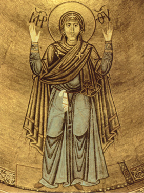 Matka Boska Orantka - wizerunki Marii Orantki były jednymi z najstarszych przedstawień Matki Boskiej, popularnymi już w sztuce wczesnochrześcijańskiej i w Cesarstwie Bizantyńskim. Maria, wznosząca obie ręce ku niebu w modlitewnym geście, przedstawiana jest tutaj jako orędowniczka ludzkich spraw, wstawiając się u swojego Syna za wiernymi, chcąc ich ochronić przed nieszczęściami ziemskiego życia i gniewem Bożym.