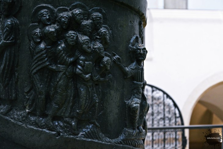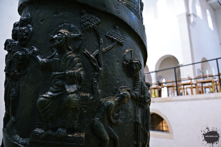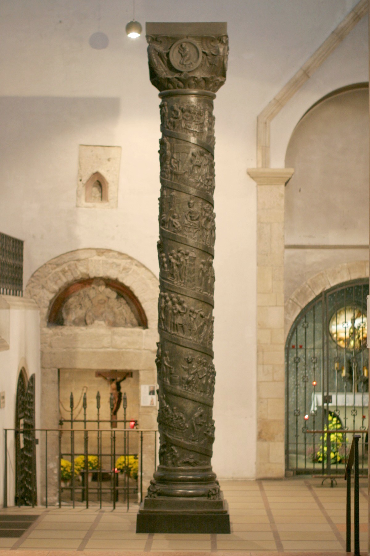 wolnostojąca brązowa kolumna zasadniczą kompozycję trzonu tworzy cykl reliefów ukazujących sceny chrystologiczne, których ciąg rozpoczyna umieszczona przy bazie scena chrztu Chrystusa w Jordanie, następnie sceny tworzą wspólny ciąg, który spiralnie obiega trzon kolumny ukazane są tam wątki m.in. cudów Chrystusa (np. Gody w Kanie, Uzdrowienie trędowatego, Wskrzeszenie Łazarza), walki ze złem (Kuszenie na pustyni), wątki misyjne (Powołanie i Rozesłanie apostołów, Chrystus i Samarytanka, Chrystus u Marii i Marty) od strony formy kolumna z Hildesheim nawiązuje do antycznej tradycji kolumn cesarskich znajdujących się głównie na rzymskich forach