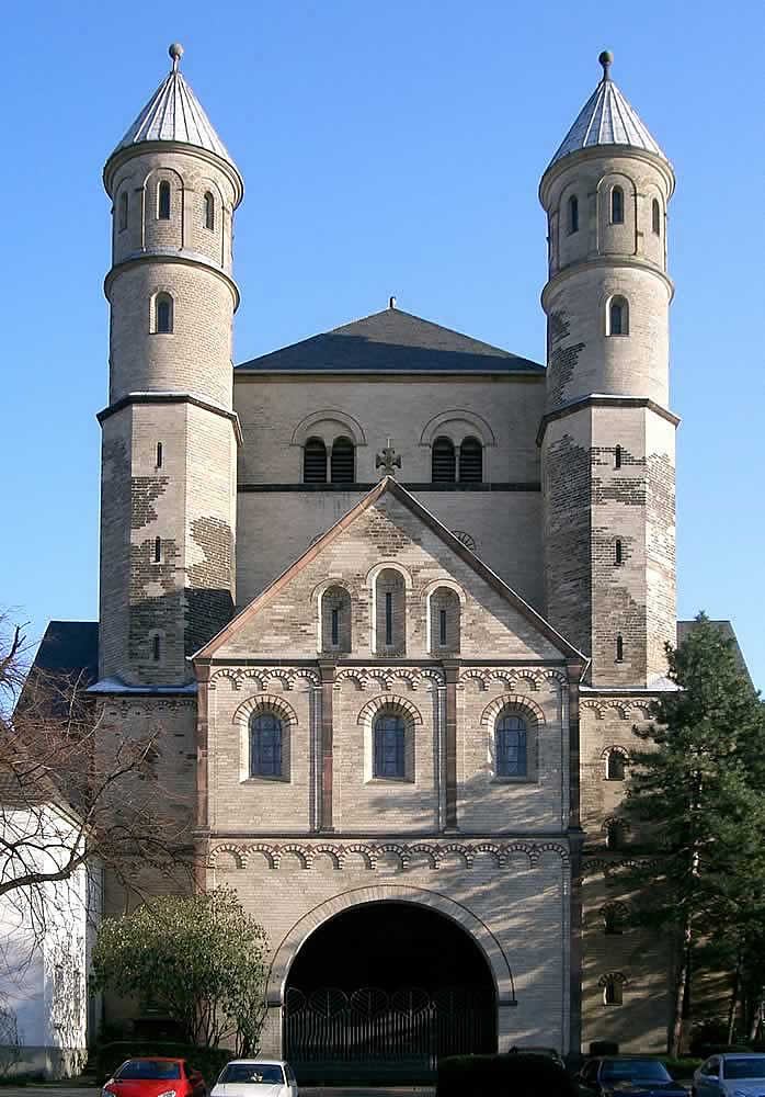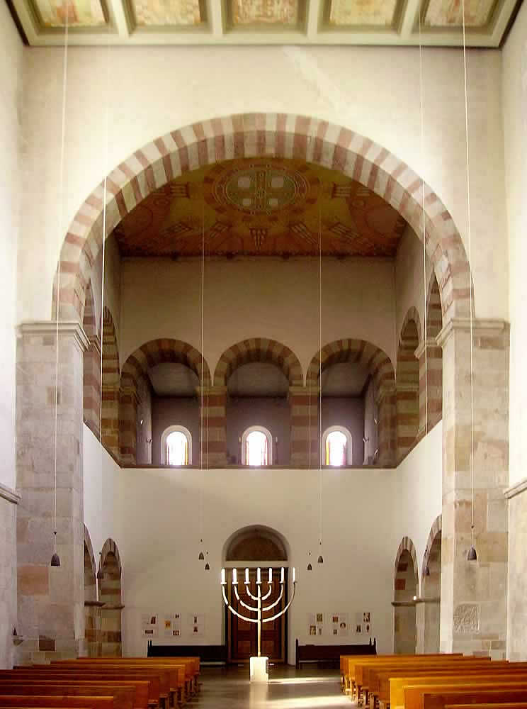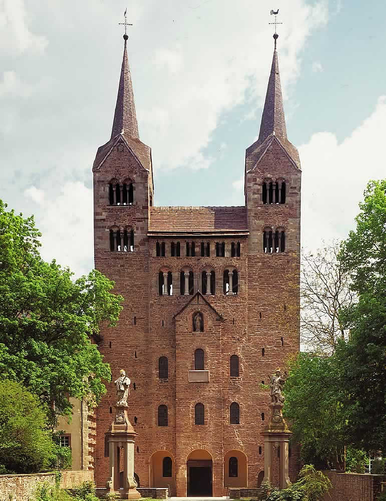 - SZTUKA KAROLIŃSKA • rozbudowana zachodnia część bazyliki, • w bazylikowych kościołach klasztornych przedromańskich i romańskich masywna część zachodnia, usytuowana poprzecznie do korpusu nawowego, flankowana wieżyczkami schodowymi, z większą wieżą, na przedłużeniu nawy głównej, mieszczącą w górnej kondygnacji otwartą do nawy kaplicę lub lożę władcy • najwcześniejszy znany kościół z westwerkiem był w Saint-Riquier (790–799), koło Abbeville westwerk, narteks jak zachodni transept, na skrzyżowaniu z nawą główną wieża, powtórzona w schemacie w transepcie wschodnim, apsydę oddzielało od transeptu wschodniego kwadratowe prezbiterium prezbiterium - chór, arch. część kościoła przeznaczona dla duchowieństwa; zwykle węższe i niższe od nawy głównej, dodatkowo wyodrębnione poprzez lekkie podwyższenie posadzki i oddzielone balustradą, ścianą tęczową; może być zamknięte półkolistą apsydą, wielobocznie lub prosto; w średniowieczu prezbiterium kościoła było przeważnie zwrócone na wschód; wokół prezbiterium biegło często obejście z wieńcem kaplic; w prezbiterium znajduje się ołtarz główny, stalle dla kleru oraz sprzęt liturgiczny plan tego kościoła powtarzano w wielu realizacjach zakonnych w czasach karolińskich