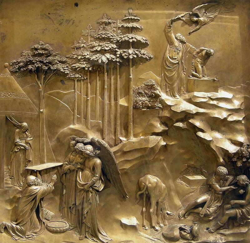 • to baptysterium znajdujące się we Florencji, tuż obok Katedry Santa Maria del Fiore. Pierwsza budowla powstała w tym miejscu w IV-VI wieku. Wówczas nie było jeszcze obecnej katedry, a wcześniejsza świątynia Santa Reparata. Baptysterium powstało na planie ośmioboku. W okresie od XI do XIII wieku zostało przebudowane i ten wygląd zachowało do dziś. Ściany zewnętrzne pokryto białym i zielonym marmurem. Dach pochodzi z XII w. Na początku XIII w. dobudowano prezbiterium. • wnętrza prowadzi troje drzwi z brązu. Od południa znajdują się drzwi ozdobione scenami z życia św. Jana Chrzciciela i alegoriami cnót, które wykonał w XIV w. Andrea Pisano. Po północnej stronie zobaczyć można drzwi wykonane na początku XV w. przez Lorenzo Ghibertiego. Zdobią je sceny z Nowego Testamentu, a także postaci Ewangelistów i czterech Doktorów Kościoła. Najsłynniejsze są Drzwi Raju, które znajdują się od wschodu. Zostały wykonane z brązu, a następnie pozłacane. Ich autorem jest Lorenzo Ghiberti. Przedstawiają sceny ze Starego Testamentu oraz postaci biblijne i artystów żyjących w tamtym okresie. Pochodzą z połowy XV w.