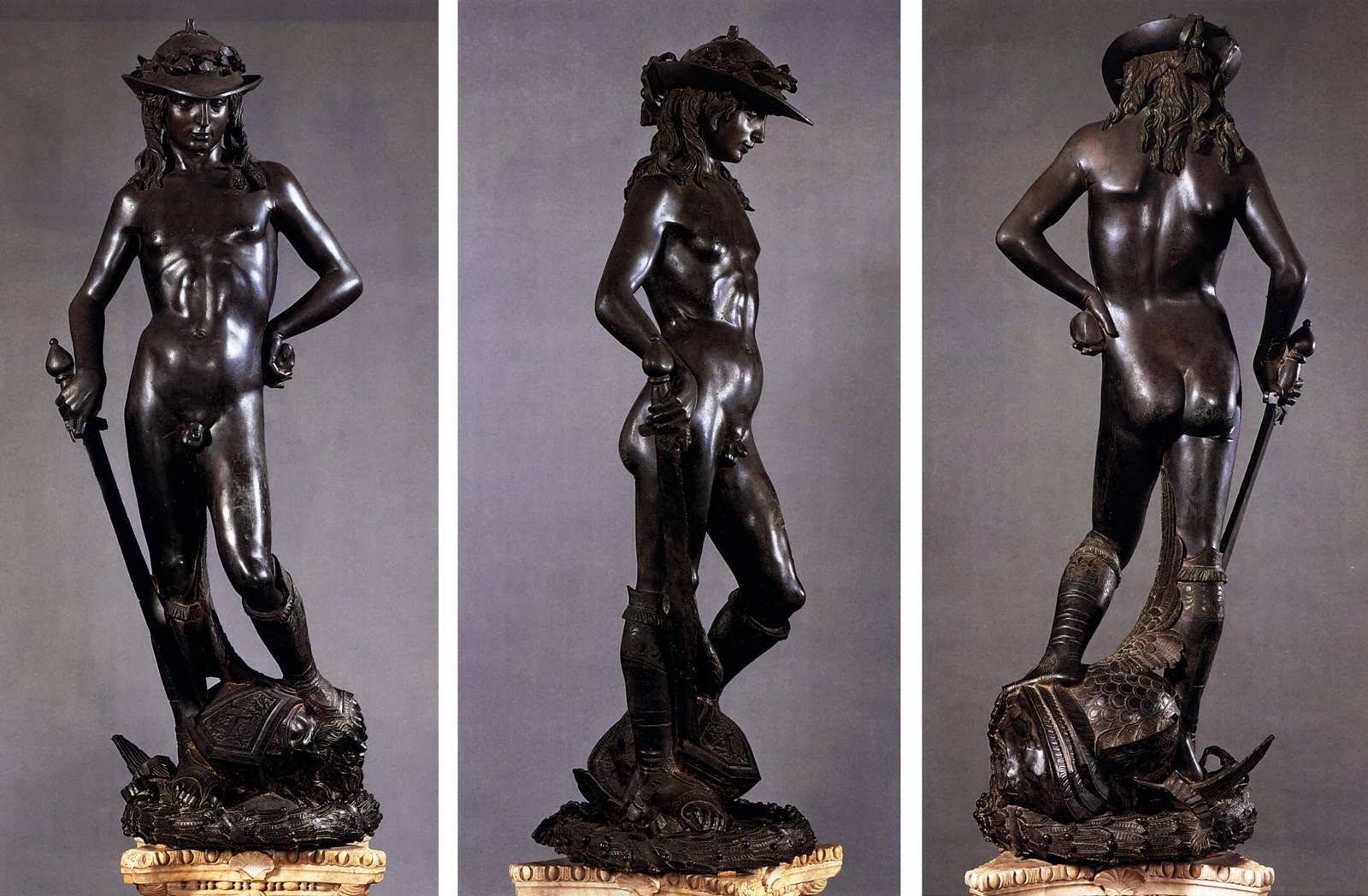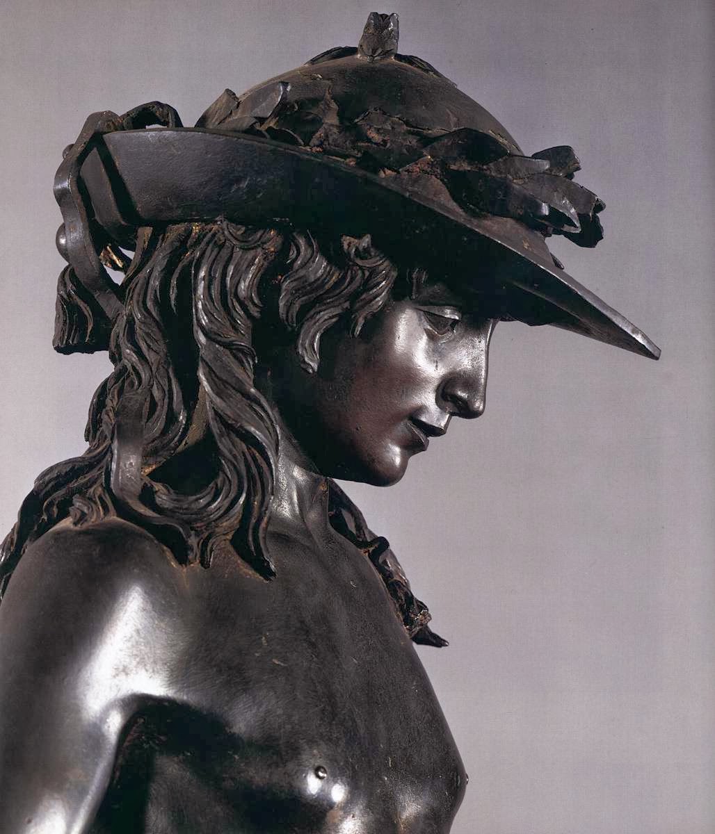 , wosk tracony, brąz, po walce, rzeźba pełnoplastyczna, był ojcem Salomona. Początkowo pełnił służbę na dworze Saula, na stałe pozostał na jego dworze po zabiciu Goliata; później został dowódcą wojsk królewskich, po śmierci Saula został królem Dawid jest jedną z najczęściej prezentowanych w sztuce postaci ze Starego Testamentu; ukazywano go jako proroka, króla-śpiewaka (w koronie, z harfą lub cytrą Trzebnica, kościół Cysterek, ok. 1230–1240), pasterza, proroka(Studnia Mojżesza, kartuzja w Champmol koło Dijon, 1398–1405, C. Sluter), wojownika. W okresie nowożytnym wielką popularnością, zwłaszcza we Włoszech, cieszył się temat triumfu Dawida nad Goliatem (Dawid z mieczem lub procą w dłoni i głową Goliata u stóp lub w ręku), interpretowany politycznie jako symbol walki włoskich republik miejskich o niezależność (rzeźby Donatella, 1430, A. del Verrocchia, ok. 1470, Michała Anioła, 1501–04). Ponadto wizerunek Dawida pojawiał się w scenach kąpieli Betsabe, w przedstawieniach Drzewa Jessego (jako jeden z przodków Chrystusa). opowieść o Dawidzie znajduje się w Księdze Samuela. Wojska Filistynów rozbiły się pod Soko, w ziemi Judy, a oddziały Saula i Izraelici w Dolinie Terebintu. Zamiast stoczyć walną bitwę, Filistyni wystawili do walki swojego najlepszego wojownika Goliata. Wśród Izraelitów przez czterdzieści dni nie znalazł się nikt kto by go pokonał. Dopiero po tym okresie w ich szeregach pojawił się przypadkiem młody pasterz Dawid i postanowił walczyć z potężnym i mocno uzbrojonym Goliatem. Walka trwała krótko. Młodzieniec wykorzystał procę i kamieniem ugodził przeciwnika w czoło. Gdy ten padł Dawid własnym mieczem ofiary odciął mu głowę. Izraelici zwyciężyli, Dawid stał się bohaterem, a później królem Donatello był pierwszym artystą od czasów antyku, który stworzył wolno stojący, niebędący częścią grupy postaci czy elementem architektury posąg nagiego mężczyzny. Posąg taki był swego rodzaju powrotem do starożytnego umiłowania ludzkiego ciała. Do rzeźby klasycznej nawiązuje także poza kontrapostu, w której rzeźbiarz ukazał Dawida. Choć poza ta wydaje się statyczna, w rzeczywistości dodaje ona postaci Dawida pewnej dynamiki przedstawił biblijnego Dawida jako młodego chłopca, przyjmującego zwycięską pozę tuż po walce z Goliatem, na którego odciętej głowie bohater wspiera nogę. W prawej dłoni trzyma on olbrzymi miecz przeciwnika, w lewej zaś, zmysłowo opartej na biodrze, ma kamień, którym przed chwilą powalił wroga. Postać młodzieńca pełna jest wdzięku oraz wyrafinowania i przypomina inne renesansowe portrety młodych mężczyzn. Dawid ma bowiem delikatne, można by rzec – dziewczęce – rysy twarzy, gładką skórę, smukłą, chłopięcą sylwetkę o doskonałych proporcjach, długie, kręcone włosy. przypuszcza się, że rzeźba powstała na zlecenie Kosmy Medyceusza, władcy Florencji, który umieścić ją miał na dziedzińcu swej willi na Via Larga. Pierwotnie miała ona stać na wysokiej kolumnie, na wzór starożytnych rzymskich posągów. Dla rodu Medyceuszy posąg Dawida miał znaczenie symboliczne – ucieleśniał bowiem obietnicę długiego panowania. Ten biblijny młody pasterz pokonał przecież potężnego wroga, a potem został królem posiadającym wielką władzę. Dlatego też rzeźba Donatella stanęła na honorowym miejscu w posiadłości Medyceuszy.