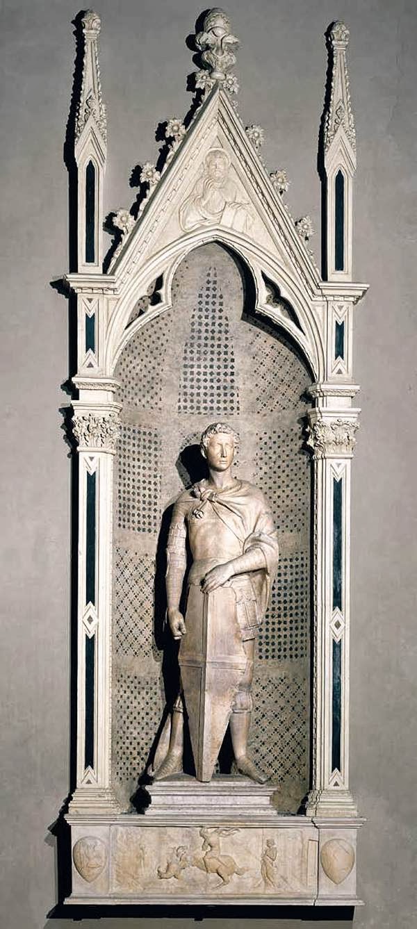 – rzeźby frontalne, delikatność ok. 1416 — wspaniały rycerz - przedstawiany zwykle w sztuce i malarstwie, na ognistym rumaku, godzący włócznią w straszliwego smoka, urodził się w Kapadocji. Wychowany w wielkiej trosce przez rodziców w wierze Chrystusowej. Wzrastał "w mądrości i łasce u Boga i ludzi". Jako młodzieniec szlachetny i wzorowy był przykładem dla swoich kolegów. Wnet zaciągnął się do wojsk cesarskich. Jako legionista rzymski doszedł stopniowo do rangi wyższego oficera, za cesarza Dioklecjana, Jerzy był wysokim urzędnikiem rzymskim - trybunem, czyli naczelnikiem miejscowego garnizonu w randze pułkownika, nie wyparł się swojej wiary, umarł torturowany