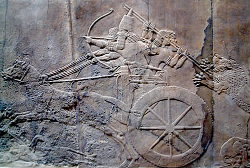 relief z przedstawieniem asyryjskiego króla polującego na lwy
