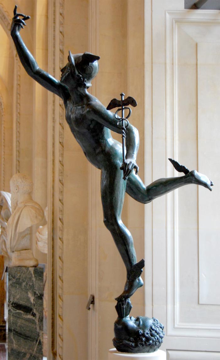 diagonalna, wydłużenie proporcji postaci po skosach, lekkość kompozycji i proporcji, brąz, ukazanie momentu rzeźba w kształcie figury lecącej, unoszonej tchnieniem wiatru nieskazitelny w rysunku kształtów w sposób śmiały i wytworny odtwarza moment lotu/ ruchu Merkurego rzeźba ogrodowa