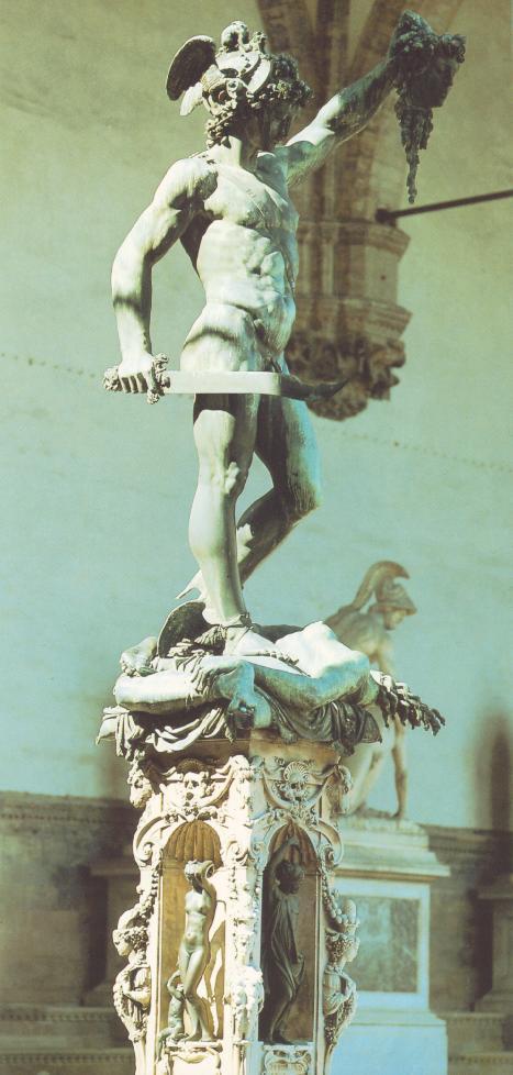 postawiona na wysokim cokole, kontrapost, noga mocno napięta, brąz, Cellini był złotnikiem więc i tu miał tendencje do zdobnictwa nawiązał do swojej koncepcji możliwości oglądania rzeźby z wielu stron, stawiając Perseusza na wysokim filarze wykonana nowatorskiej technice odlewu z brązu - zbytnią dbałość o szczegóły, typową dla złotnika