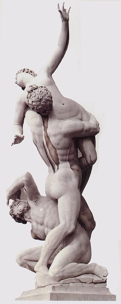 jest uznawana za najznamienitsze dzieło w dorobku artysty podkreśla się, iż trzy pełnopostaciowe figury zostały wykute w jednym bloku marmuru, co ma świadczyć o niezwykłej biegłości artysty. Dla Giambologny praca nad rzeźbą była przede wszystkim popisem warsztatowej sprawności temat porwania Sabinek cieszył się ogromną popularnością w dobie renesansu, a także w okresie rozwoju manieryzmu i w dobie baroku. Szczególnym wyzwaniem był zwłaszcza dla rzeźbiarzy. Stanowił bowiem doskonałą okazję do zaprezentowania sprawności w oddawaniu anatomii ludzkiego ciała, jak też rzeźbiarskiej wirtuozerii w ukazaniu gwałtownego ruchu, skrętu, dynamiki grupa złożona jest z trzech splątanych postaci. Jej kompozycję można w istocie zamknąć w wydłużonym prostokącie. Stojący w skręcie młodzieniec obydwiema rękami podtrzymuje wygiętą do tyłu kobietę, uchwyconą w gwałtownym ruchu. Jej lewa ręka jest wyciągnięta do góry, prawa z kolei, zgięta w łokciu, opada do dołu. Głowa kobiety odchylona jest do tyłu. Na samym dole, pomiędzy nogami młodzieńca, przykucnął starzec. Jego pochylona postać ukazana jest w gwałtownym skręcie, tak jakby próbował wymknąć się spomiędzy nóg stojącego mężczyzny. Prawą rękę oparł na biodrze, lewą, uniesioną do góry i zgiętą w łokciu, kieruje w stronę twarzy. Palce prawej dłoni są rozczapierzone postaci pozostają ze sobą w ścisłym kontakcie, także psychologicznym. Obydwaj mężczyźni kierują spojrzenia ku górze, w stronę kobiety, twarze wszystkich postaci artysta opracował tak, by zasugerować poruszenie, aczkolwiek trudno mówić w tym przypadku o próbie stworzenia portretów psychologicznych, oddania emocji bohaterów. Zamęt, niepokój i szybkość towarzyszące sytuacji artysta oddał poprzez mistrzowskie opracowanie gestów i ruchu postaci: gwałtowności wyskoku wyrywającej się kobiety, napięcia mięśni ciała młodzieńca próbującego ją utrzymać, czy w końcu spięcia i skłębienia ciała starca. Każda z postaci to w istocie wirtuozerskie studium anatomii i poszczególnych, zatrzymanych w czasie, etapów ruchu. Postaci są powykręcane, przerysowane odchylenia rąk, głów i łuki wygiętych ciał mają świadczyć o gwałtowności sytuacji. Operując kategoriami formalnymi można powiedzieć, iż każda z postaci to wariacja na temat figury serpentinaty, a więc takiego ujęcia postaci, które pokazuje ją w pełnym dynamiki skręcie. W pracy Giambologny ów skręt przestaje być naturalny, jest wyolbrzymiony, wykoncypowany, nieobecny w naturze. Każdy mięsień wyrysowany na ciałach postaci i każdy zamrożony gest porywu mają być dowodem niepodważalnej wirtuozerii rzeźbiarza