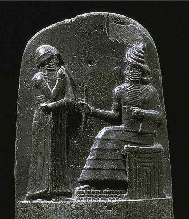Górny fragment steli Hammurabiego z przedstawieniem boga Szamasza wręczającego Hammurabiemu symbole władzy królewskiej.