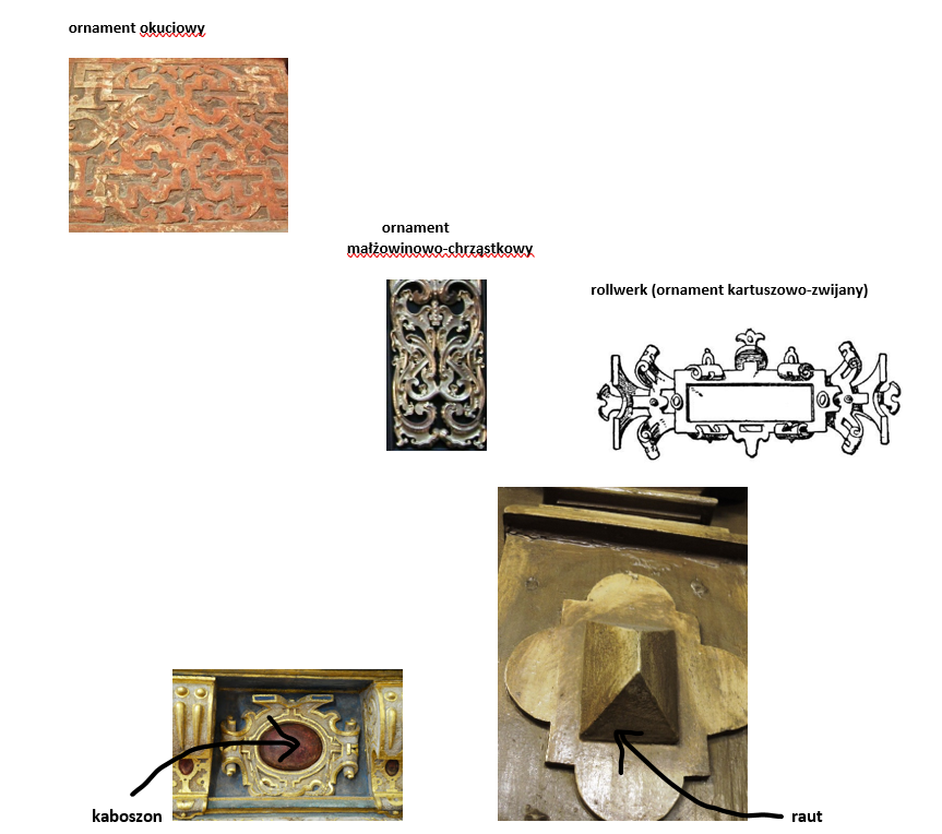 okuciowy, karboszony, małżowinowo – chrząstkowy, rollwerk( ornament kartuszowo jakiś tam), rauty